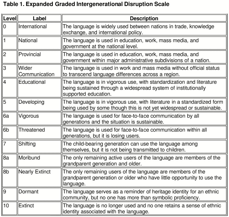 Ethnologue. (2025, September 25). How do we classify and measure the status of languages? Retrieved from Ethnologue: https://www.ethnologue.com/insights/classifying-language-status/